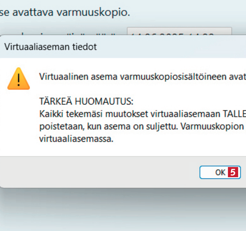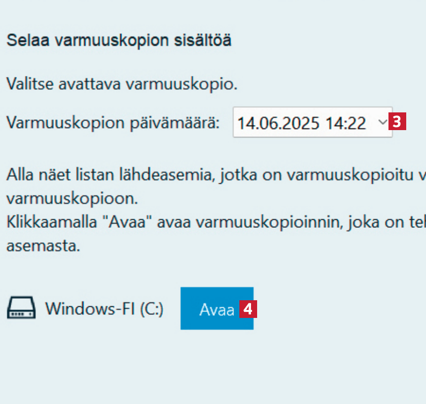 Valitse haluamasi varmuuskopion päivämäärä 3 ja valitse Avaa 4. Tässä esimerkissä kyseessä on Casema. Varmuuskopio avautuu asemana Resurssienhallinnassa.