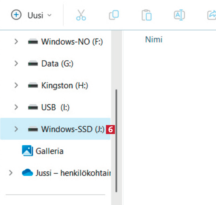 Varmuuskopio löytyy asemana 6 Resurssienhallinnan kohdasta Tämä tietokone. Tässä varmuuskopion nimi on Windows-SSD ja sen asemakirjain on J. Napsauta asemaa.