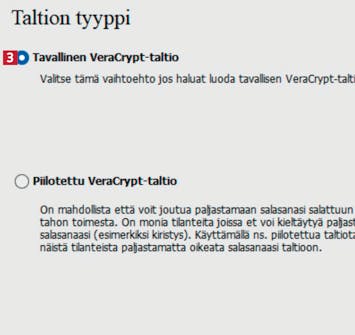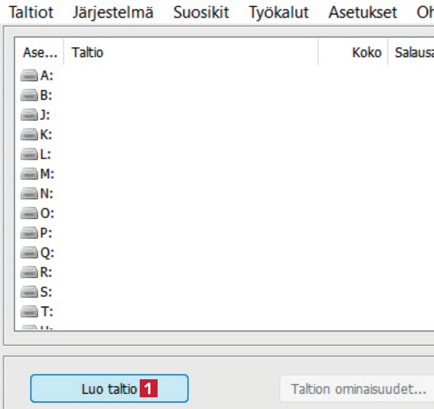 Aloita lataamalla VeraCrypt verkkosivuiltamme ja asentamalla ohjelma omalle koneelle. Avaa sitten ohjelma ja valitse Luo taltio 1.