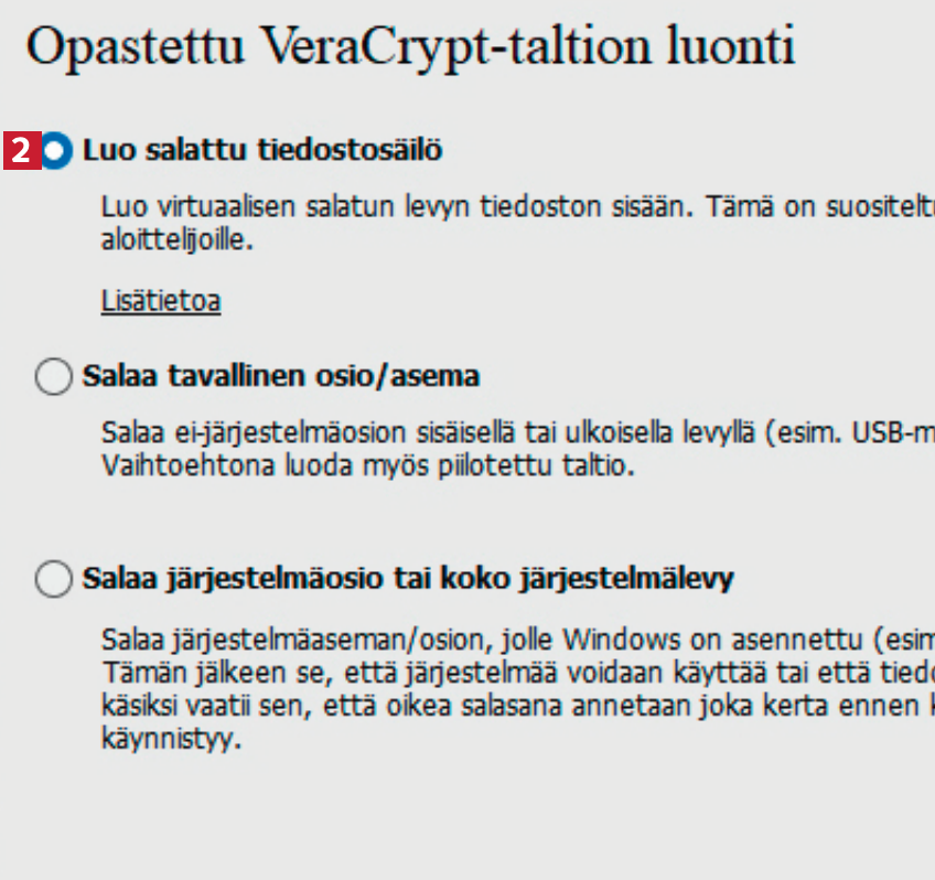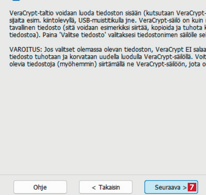 Valitse Luo salattu tiedostosäilö 2 niin, että siihen lisätään merkintä. Valitse sitten ikkunan oikeasta alakulmasta Seuraava.