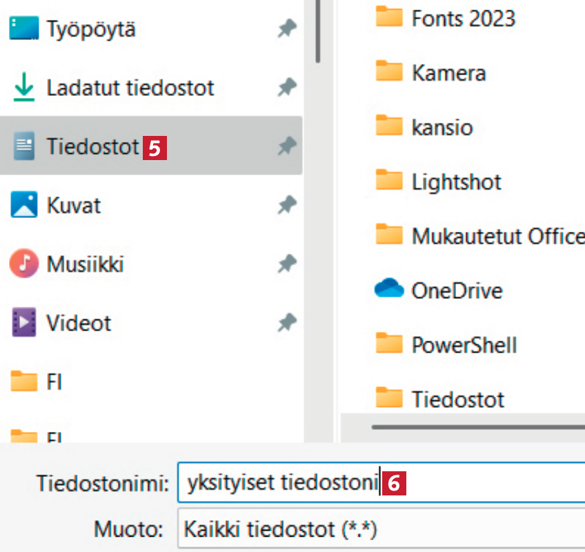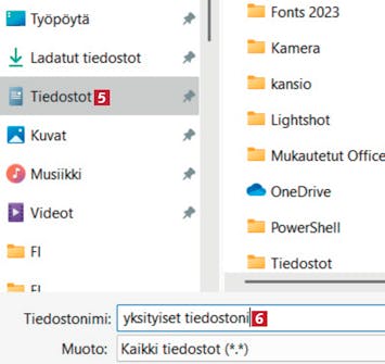 Valitse tiedoston sijainti koneella, kuten kansio Tiedostot 5. Anna tiedostolle nimi 6 ja valitse ikkunan oikeasta alakulmasta Tallenna.