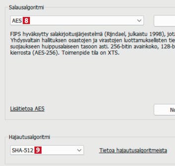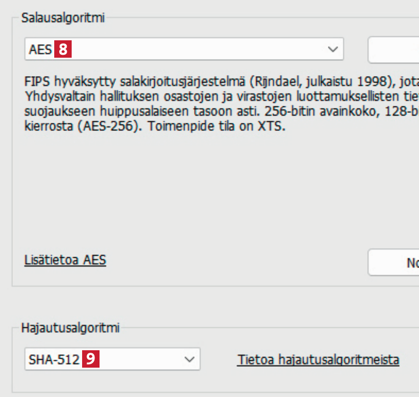 Valitse ylhäältä algoritmi AES 8 ja alhaalta SHA-512 9 . Ohjelma käyttää näitä algoritmeja tiedostojen salaamiseen. Valitse sitten Seuraava.