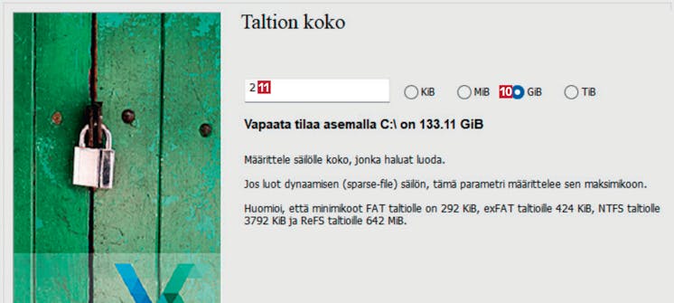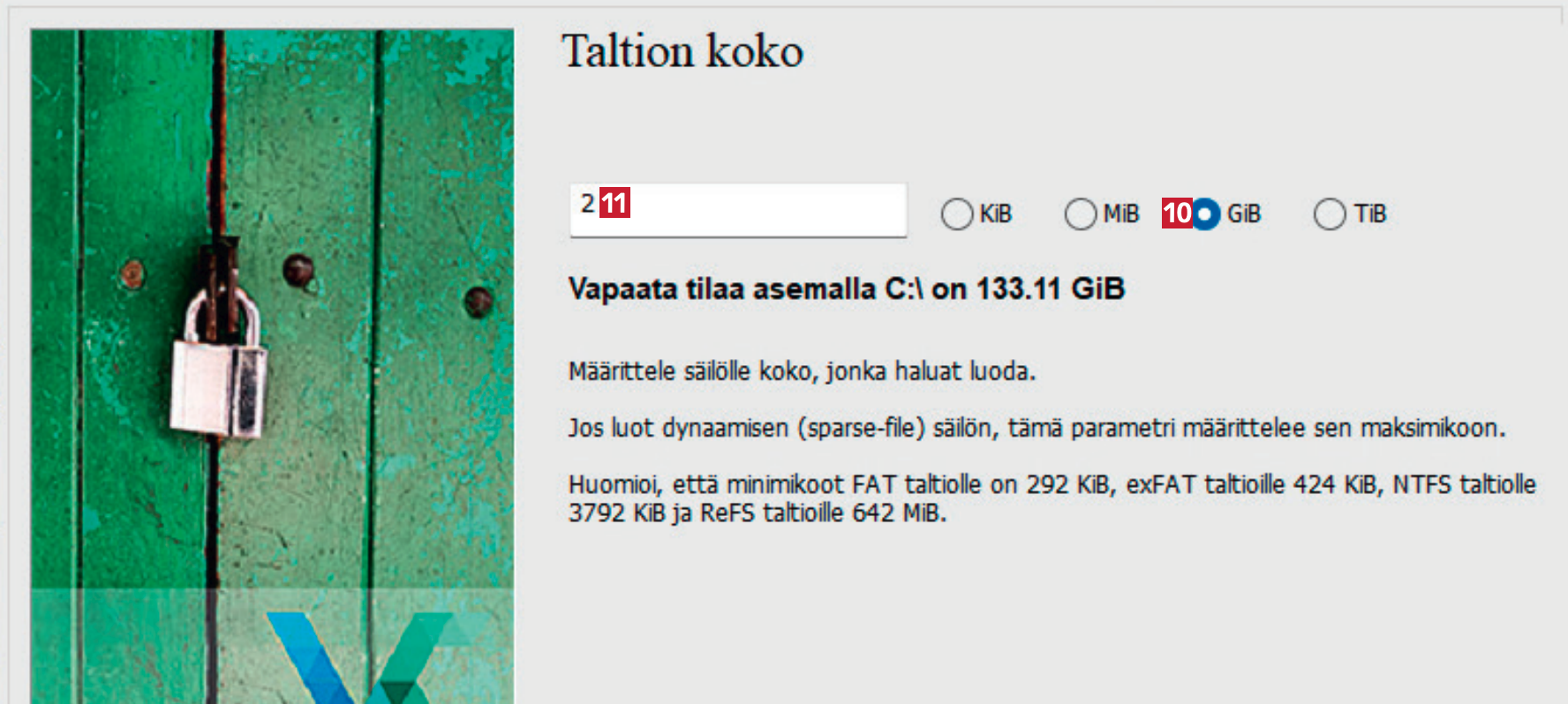 Valitse seuraavaksi salatun aseman koko. Ohjelma ottaa tilan tietokoneen kiintolevyltä. Valitse esimerkiksi GB 10, joka tarkoittaa gigatavua. Kirjoita haluamasi gigatavujen määrä kenttään 11. Aseman koko riippuu käytettävissä olevasta kiintolevytilasta. Kun olet valinnut koon, napsauta kohtaa Seuraava.