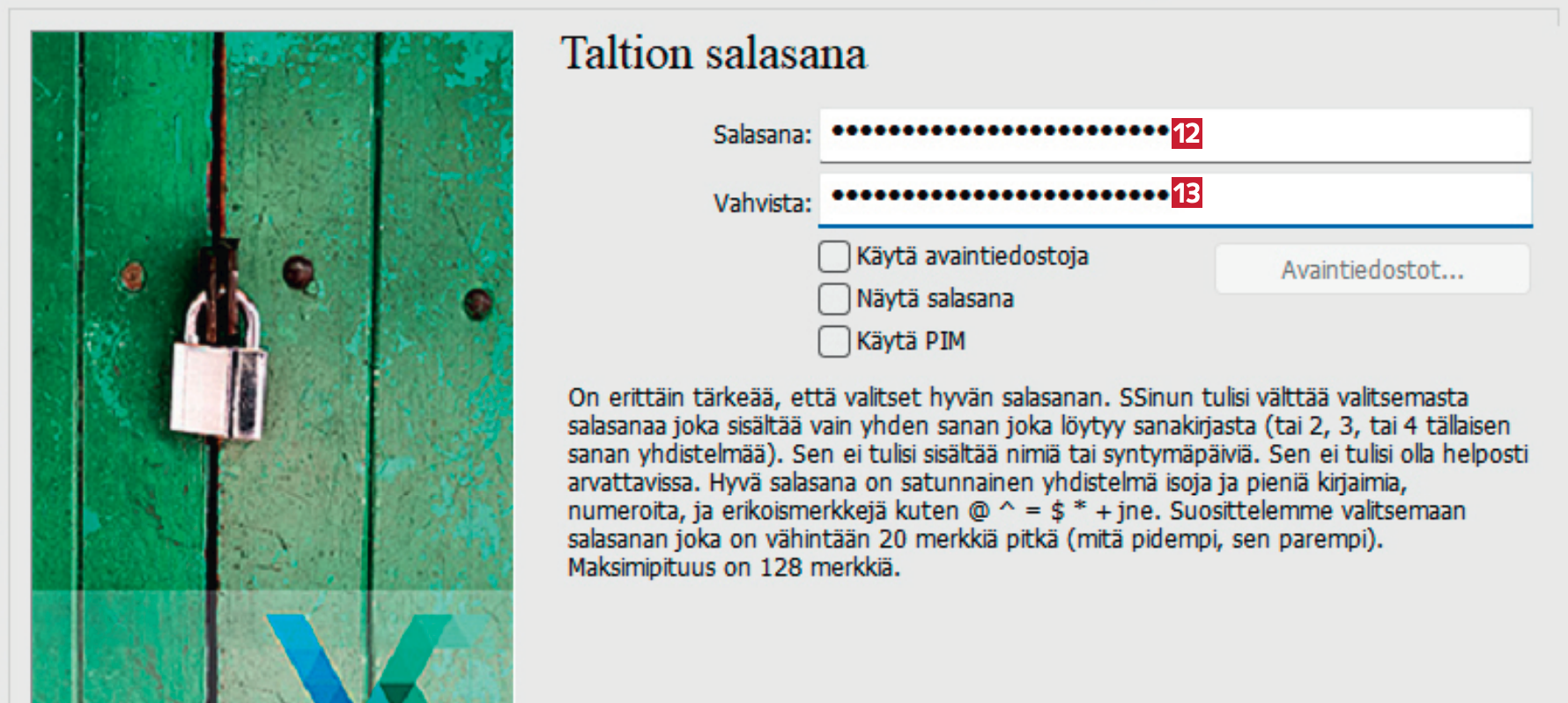 Määritä salasana, jota käytetään salatun aseman lukituksen avaamiseen, kohdassa Salasana 12. Kirjoita sama salasana uudelleen kohtaan Vahvista 13. Vahva salasana sisältää vähintään 20 merkkiä, isoja ja pieniä kirjaimia sekä numeroita ja erikoismerkkejä. Valitse Seuraava, kun olet valmis.
