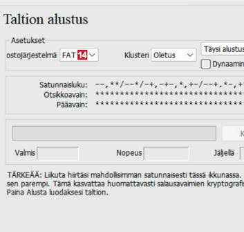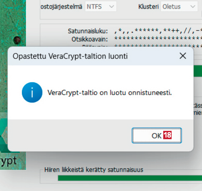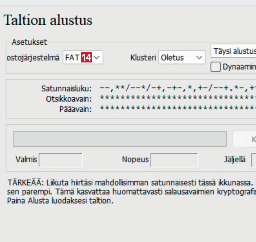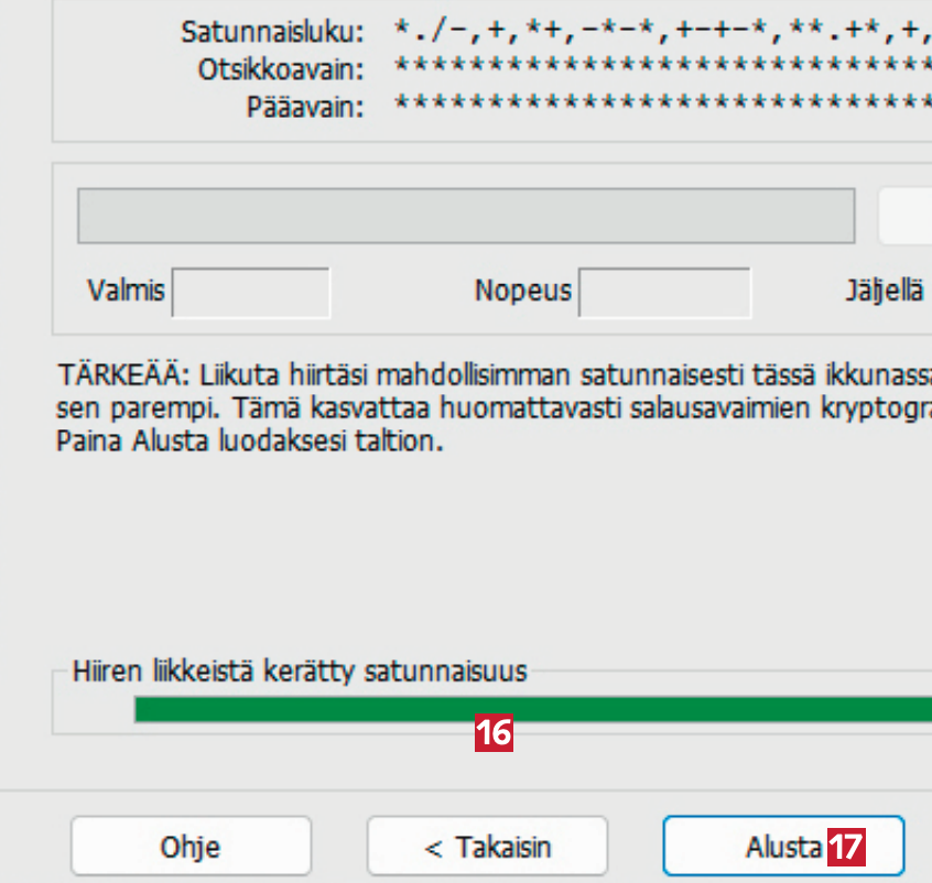 Seuraavaksi on luotava salausavain. Voit tehdä sen siirtämällä hiirtä satunnaisesti ohjelmaikkunassa, kunnes vihreä kenttä on täynnä. 16. Valitse sitten Alusta 17.