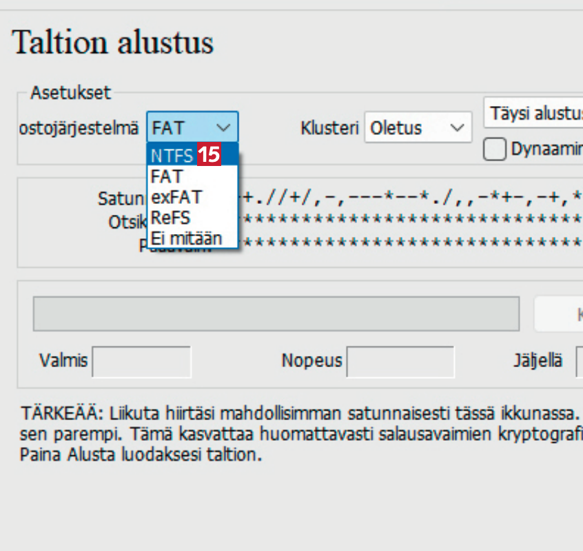 Valitse avautuvasta valikosta NTFS 15, joka on Windowsin oletusarvoinen tiedostojärjestelmä tiedostojen tallentamiseen ja järjestämiseen.