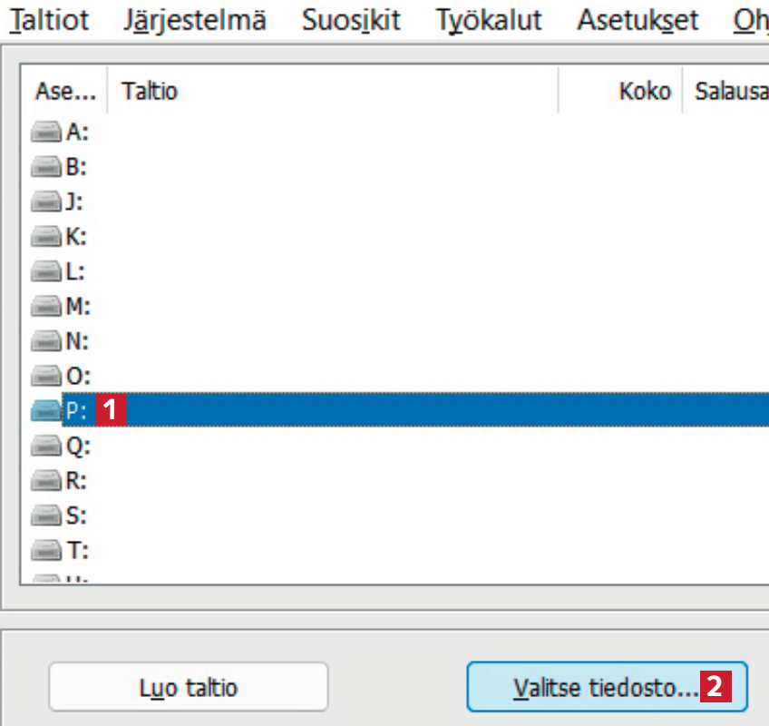 Avaa ensin VeraCrypt ja valitse luettelosta käytettävissä oleva aseman kirjain salatulle asemalle 1. Valitse sitten Valitse tiedosto… 2.