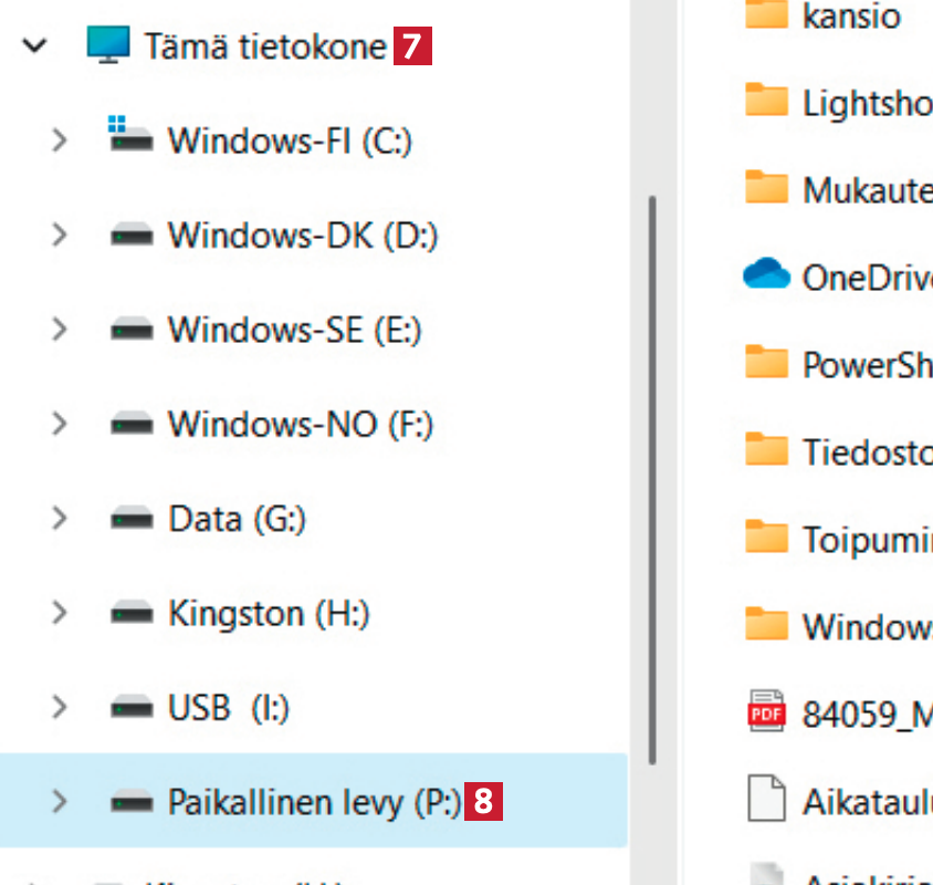 Asema on lisätty Resurssienhallintaan kohtaan Tämä tietokone 7 valitsemallasi kirjaimella 8. Avaa asema napsauttamalla sitä.